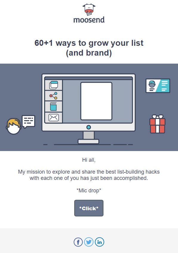 Use great visuals and an attractive heading to get your audience hooked to the article. Animated .gifs like the one in the moosend newsletter (see the animated portion here) can gather additional engagement.