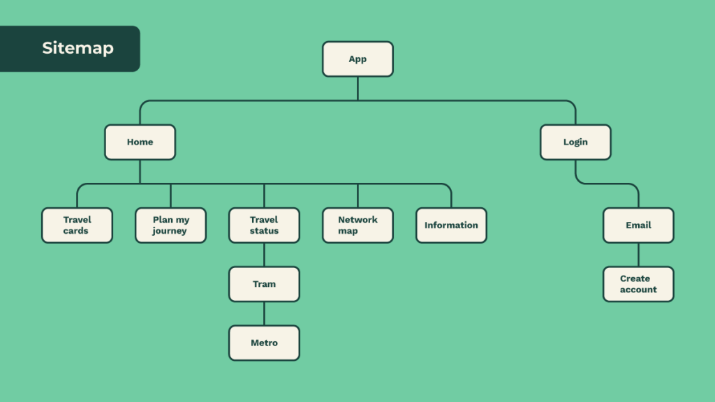 A sitemap contains all the information and components of a digital product. They are used as reference points for wireframes and next-stage content maps.